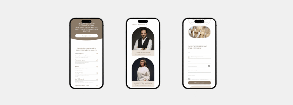 Наш клиент — банкетный зал Asti Hall, площадка для свадеб, корпоративов и частных мероприятий. Команда зала обратилась к нам с запросом на сайт, который передаёт атмосферу пространства: стиль, уют, авторскую кухню и высокий уровень сервиса. Нужна была визуальная история, способная продавать не только зал, но и эмоцию от праздника.