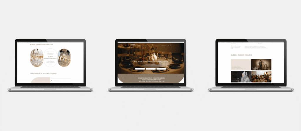 Основой визуальной концепции стал чистый белый фон — он делает сайт лёгким и пропускает вперёд атмосферные фото банкетного зала.