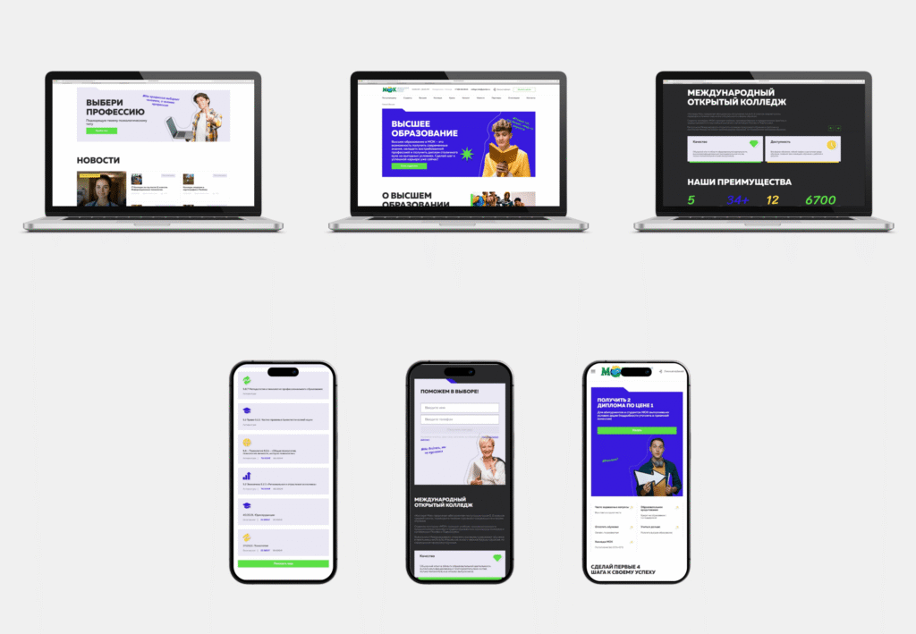 Наш клиент — Международный открытый колледж «МОК», образовательное учреждение, которое даёт абитуриентам возможности поступления после 9 и 11 классов, переводов в течение года и последующего продолжения обучения в престижных вузах. Колледж активно сотрудничает с предприятиями Москвы и Подмосковья, обеспечивает практики и трудоустройство студентов, и хотел получить сайт, который бы честно и понятно рассказывал о всех этих возможностях. Перед нами стояла задача — сформировать цифровую витрину, которая одновременно бы демонстрировала статус учреждения, облегчала навигацию для абитуриентов и их родителей, структурировала большой объём информации о специальностях и практиках, и при этом работала как инструмент для привлечения реальных заявок.