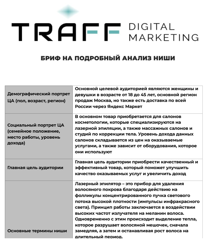• Бриф на подробный анализ ниши показал, какие запросы действительно приводят к покупке, а какие трафик просто «тянут» без результата.