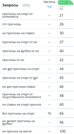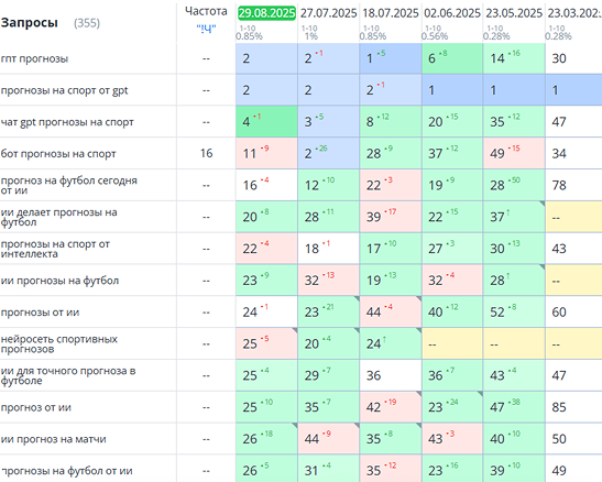 Перед нами стояла задача комплексного SEO-продвижения нового сайта с нулевой авторитетностью, предоставляющего прогнозы на спортивные события, генерируемые с помощью искусственного интеллекта. Проект длился на протяжении девяти месяцев. Основная цель заключалась в выведении сайта в топовые позиции поисковой выдачи по большинству ключевых запросов в данной тематике и повышение числа переходов в телеграм-канал.