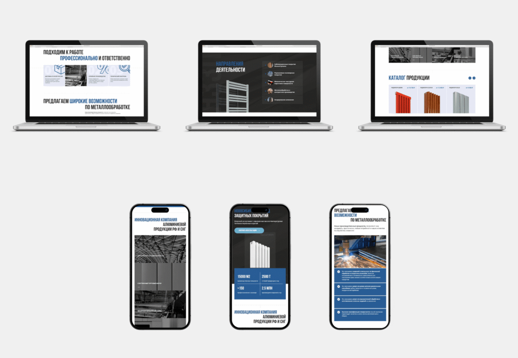 Макеты продуманы с акцентом на ясность информации: крупные заголовки, удобные карточки продукции, четкая типографика и контрастные блоки позволяют пользователю быстро ориентироваться на сайте и находить нужные данные. Визуальная концепция отражает индустриальный характер компании и делает лендинг одновременно современным и функциональным.