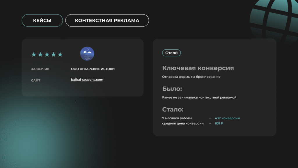 За 9 месяцев после старта клиент получил 437 конверсий по средней стоимости 831 ₽. Канал стал стабильным источником обращений и броней, а загрузка парк-отеля выросла за счёт выстроенной, прозрачной и управляемой рекламной стратегии.