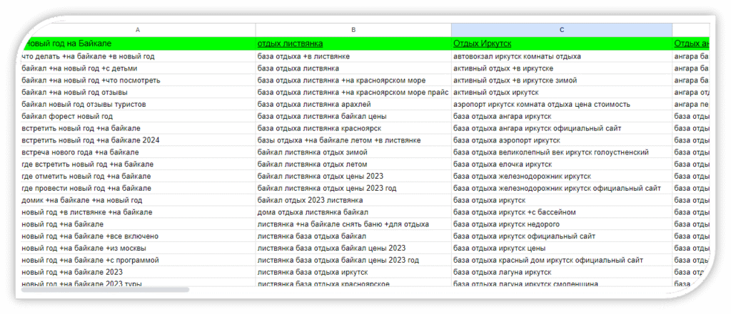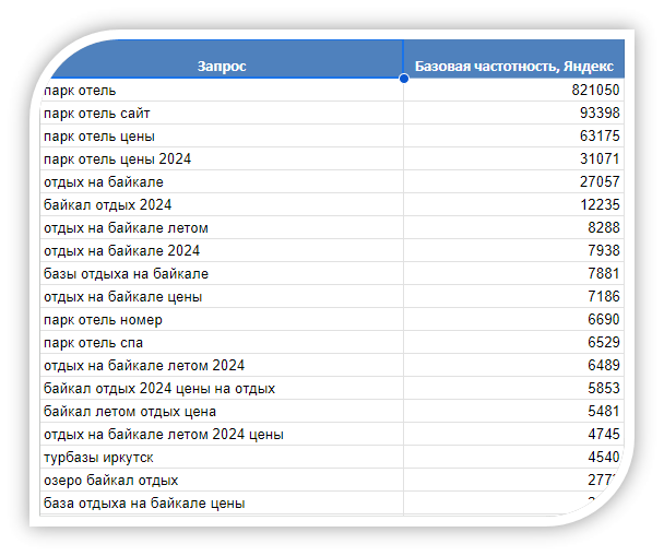 Мы начали с полного анализа ниши отдыха на Байкале и поиска реальных точек спроса: сезонность, география аудитории, запросы по размещению, форматы отдыха и конкурентное окружение. На основе этого собрали расширенное семантическое ядро и разделили его на отдельные группы: брендовые, коммерческие, геозависимые, сезонные и высокочастотные информационные запросы.