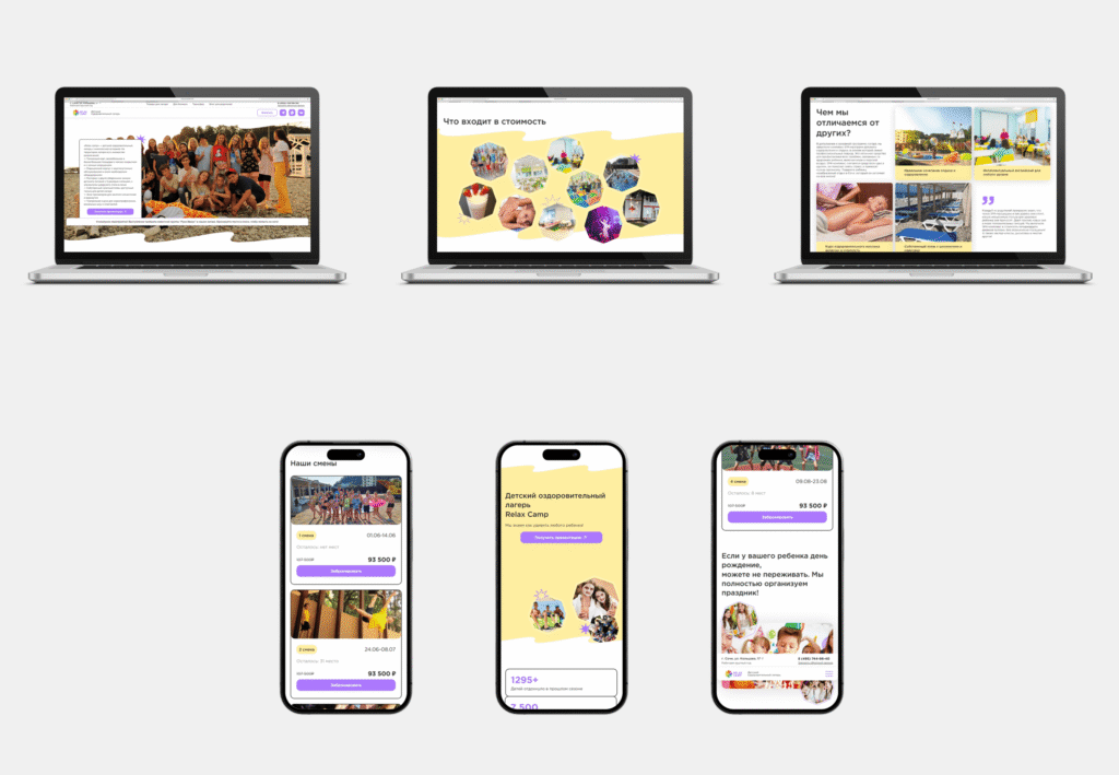 Мы создали лендинг, который передаёт атмосферу детского отдыха и профессионального подхода SPA-комплекса. Родители могут легко получить полную информацию, увидеть преимущества программы и быстро оставить заявку. Сайт стал эффективным инструментом привлечения новых клиентов и помогает создавать доверие к бренду Relax Camp.
