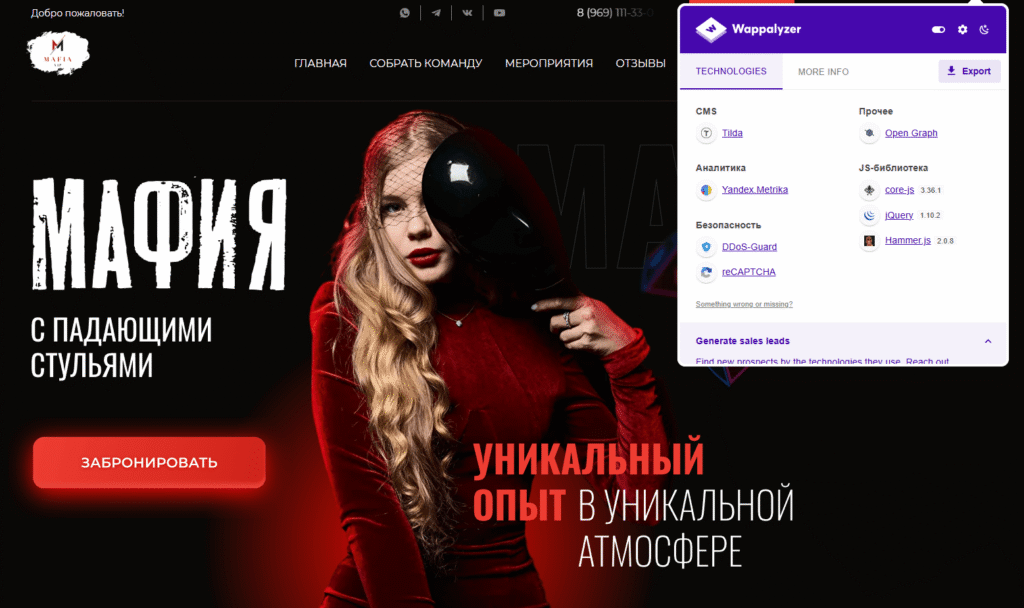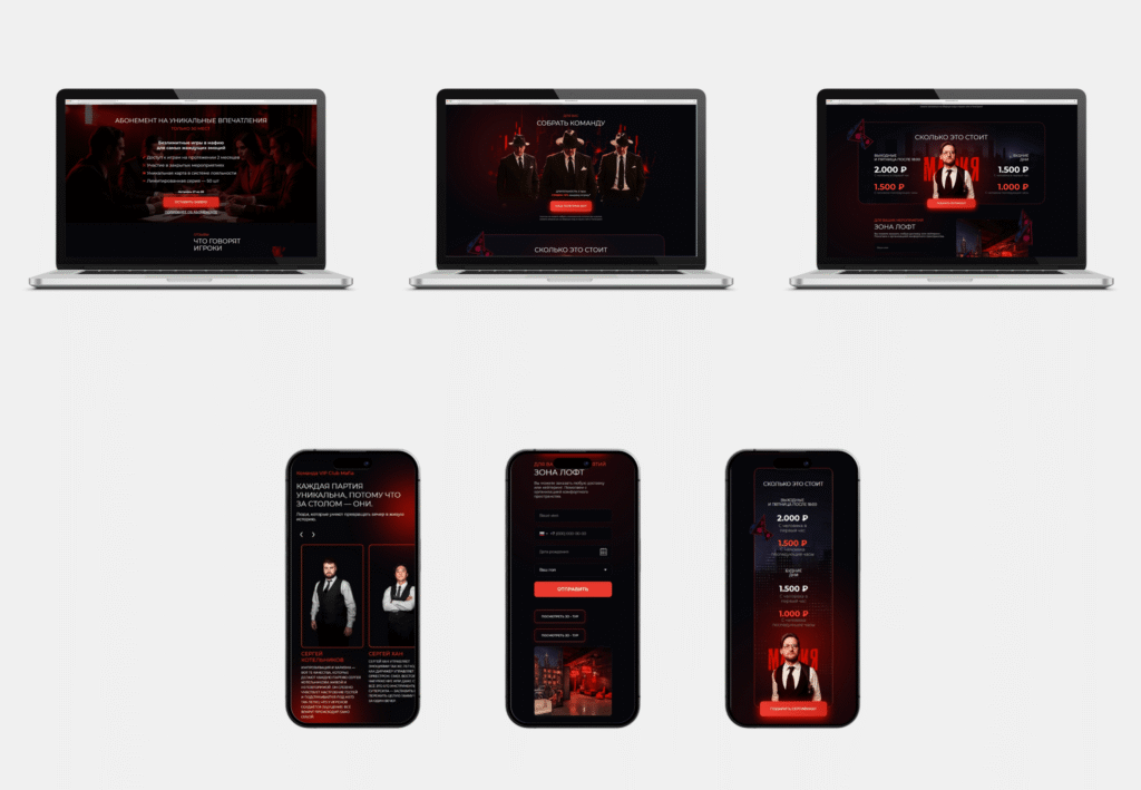 Наш клиент — VIP Club Mafia, организатор уникальных оффлайн-вечеринок в формате мафии с механикой «падающих стульев». Задача состояла в том, чтобы создать эффектный лендинг, который сразу передаёт атмосферу интриги и адреналина, объясняет суть формата простым языком и превращает посетителя в участника — через быстрое бронирование или заявку. Важно было сделать страницу, которая одновременно выглядит премиально и демонстрирует игровую дерзость проекта, сохраняя понятную навигацию для новых гостей.